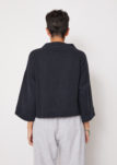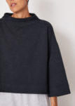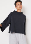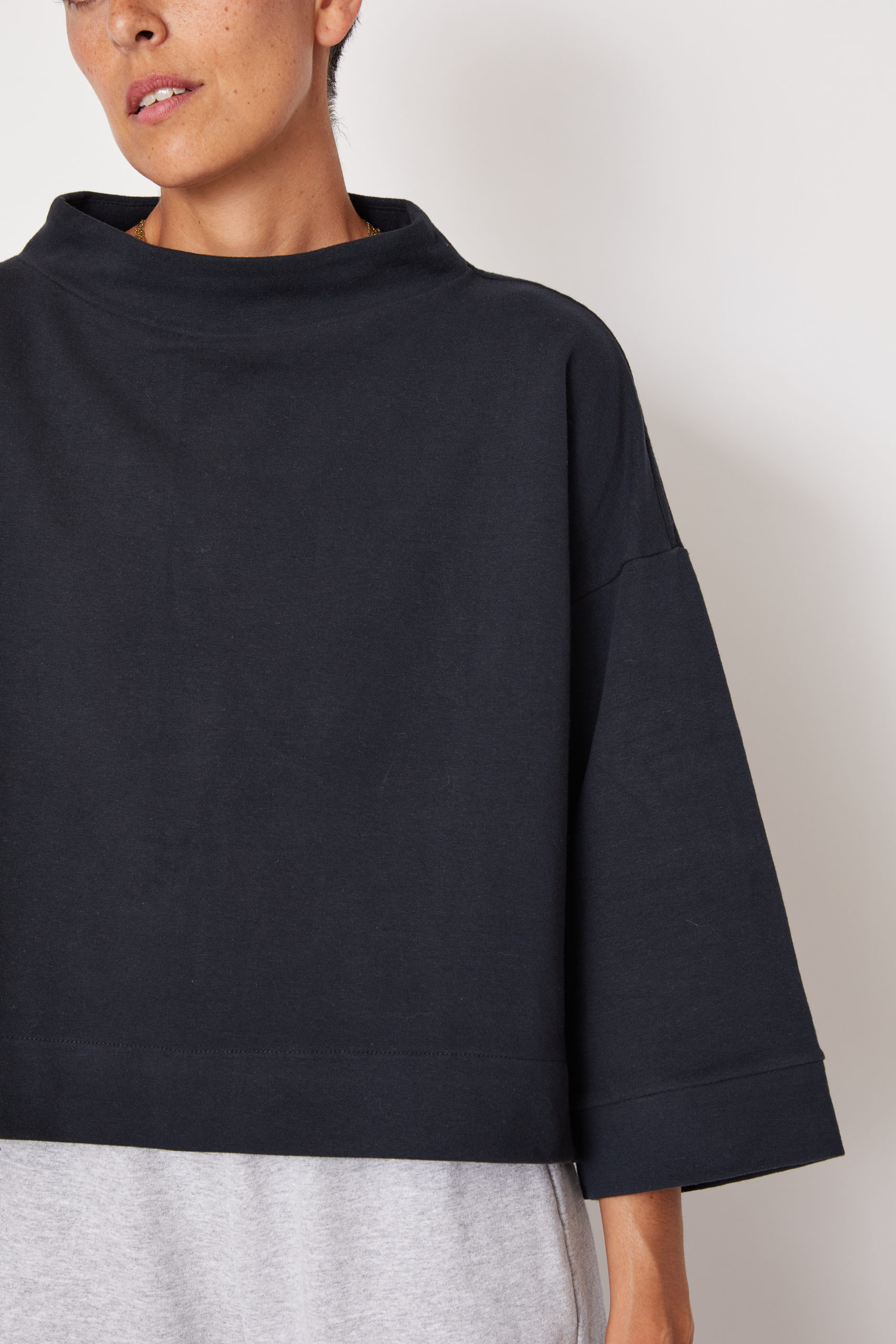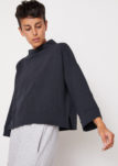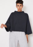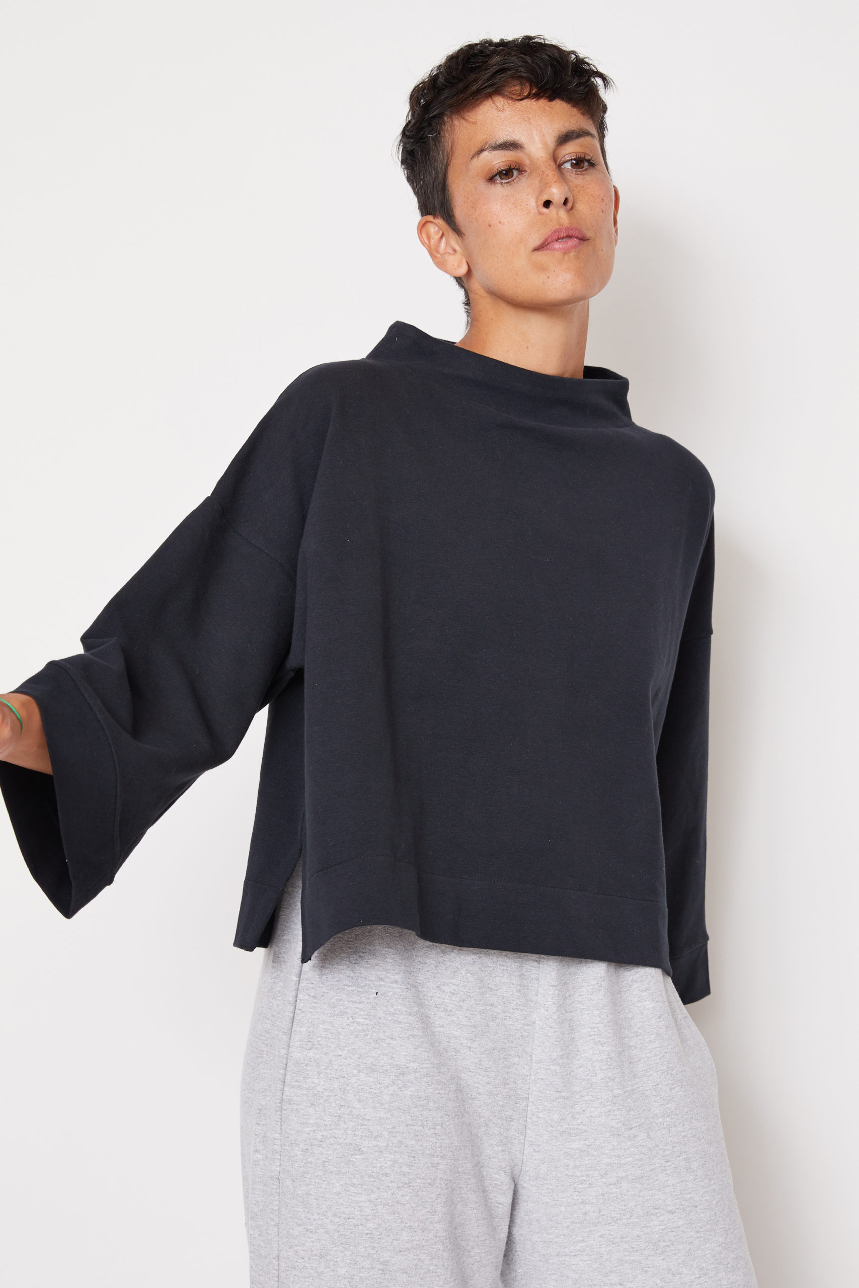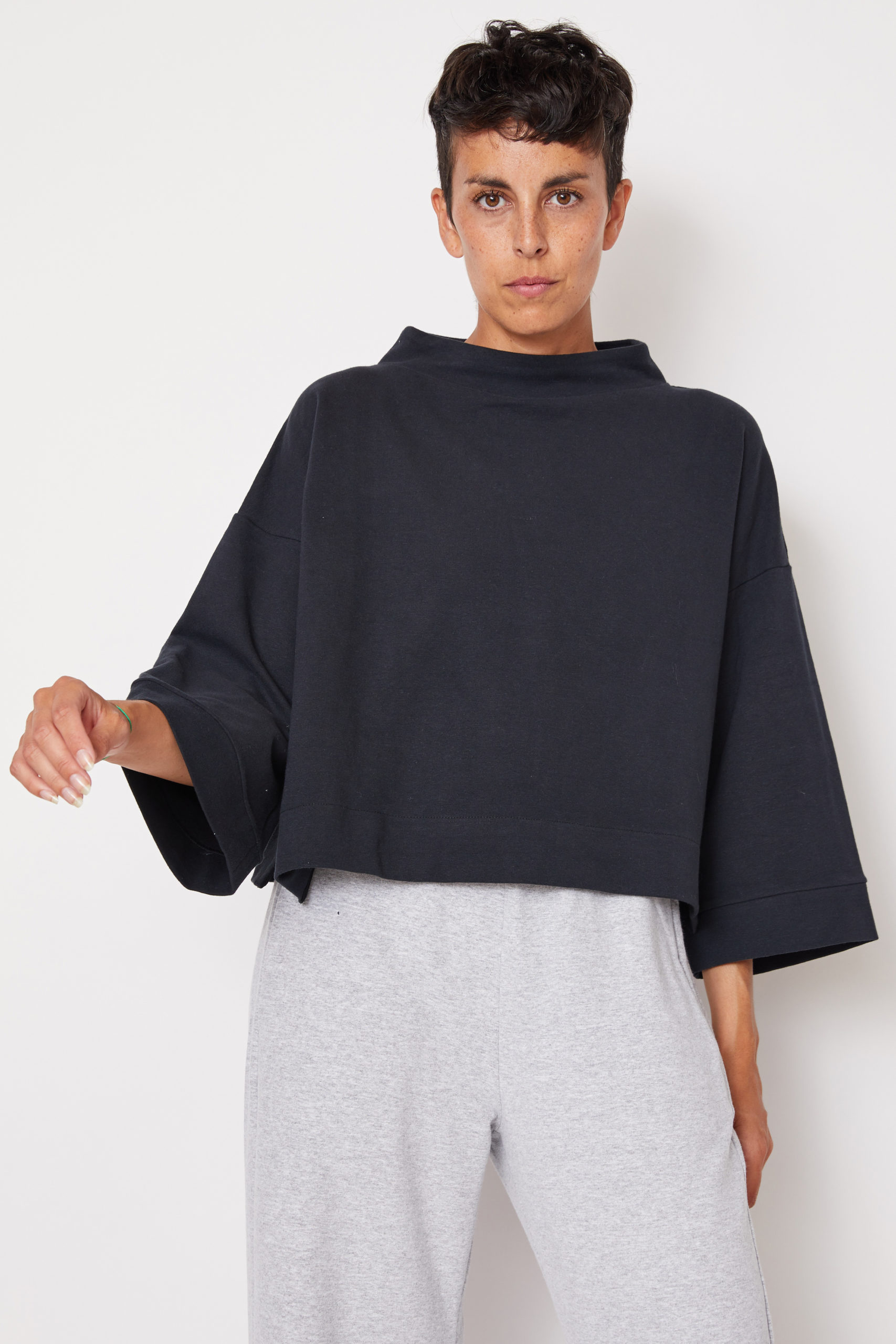 En rústico esmerilado de una mano increíble, gamuzado al tacto. La manga amplia tres cuartos y el hombro caído da un efecto de prenda relajada, de calce oversize con escote bote y cuello semi polera estructurando la silueta. El ruedo tiene una terminación con dos tajos en sus laterales con detalle de cinta hilera al tono en su interior. Composición: 95% algodón · 5% elastano.