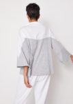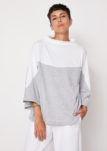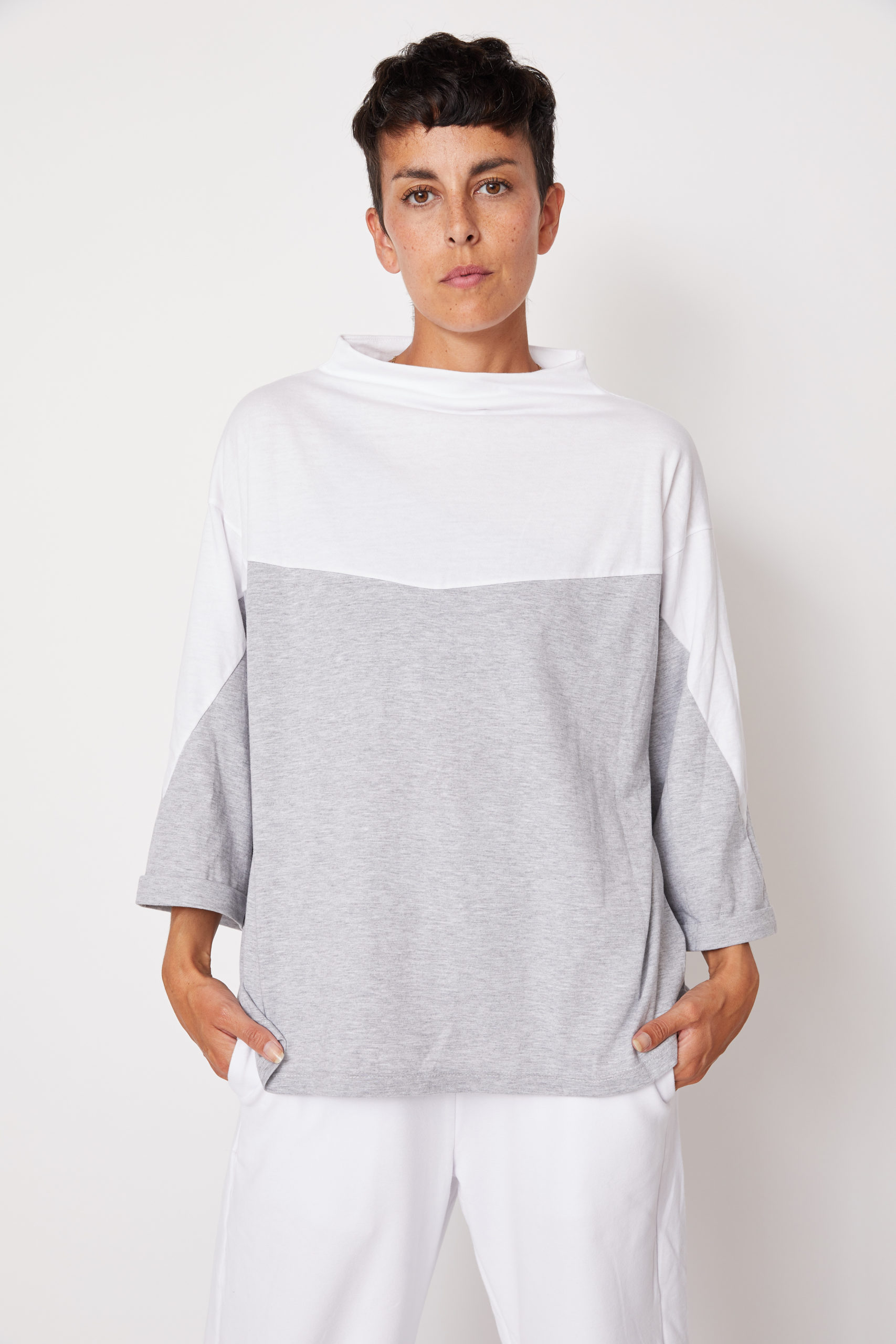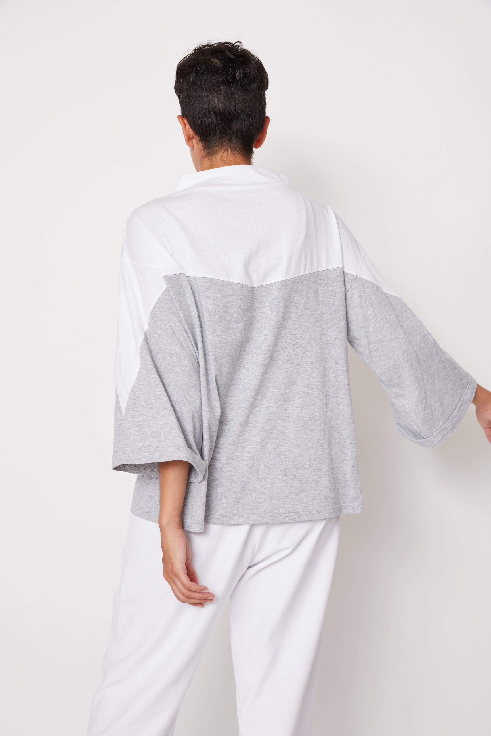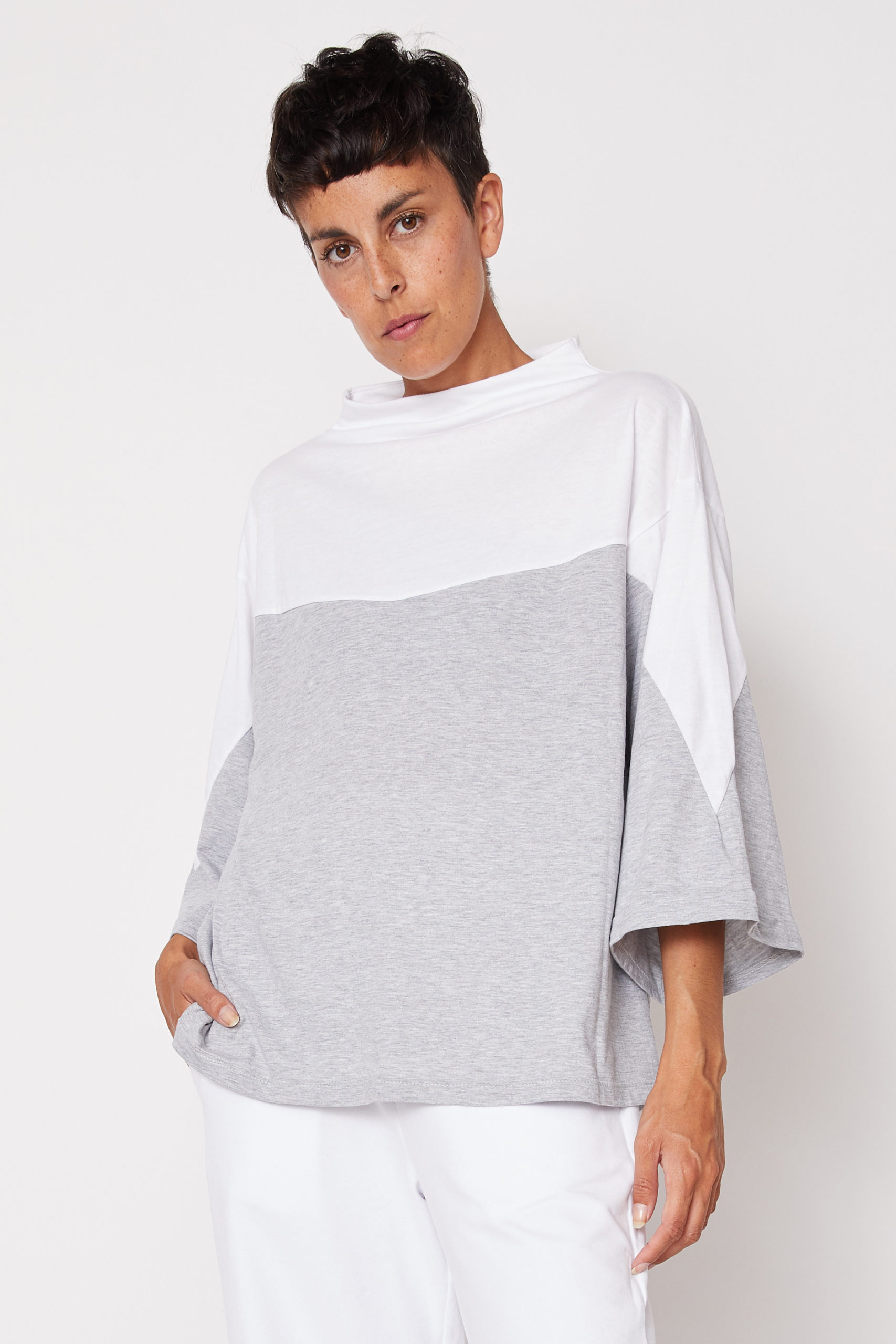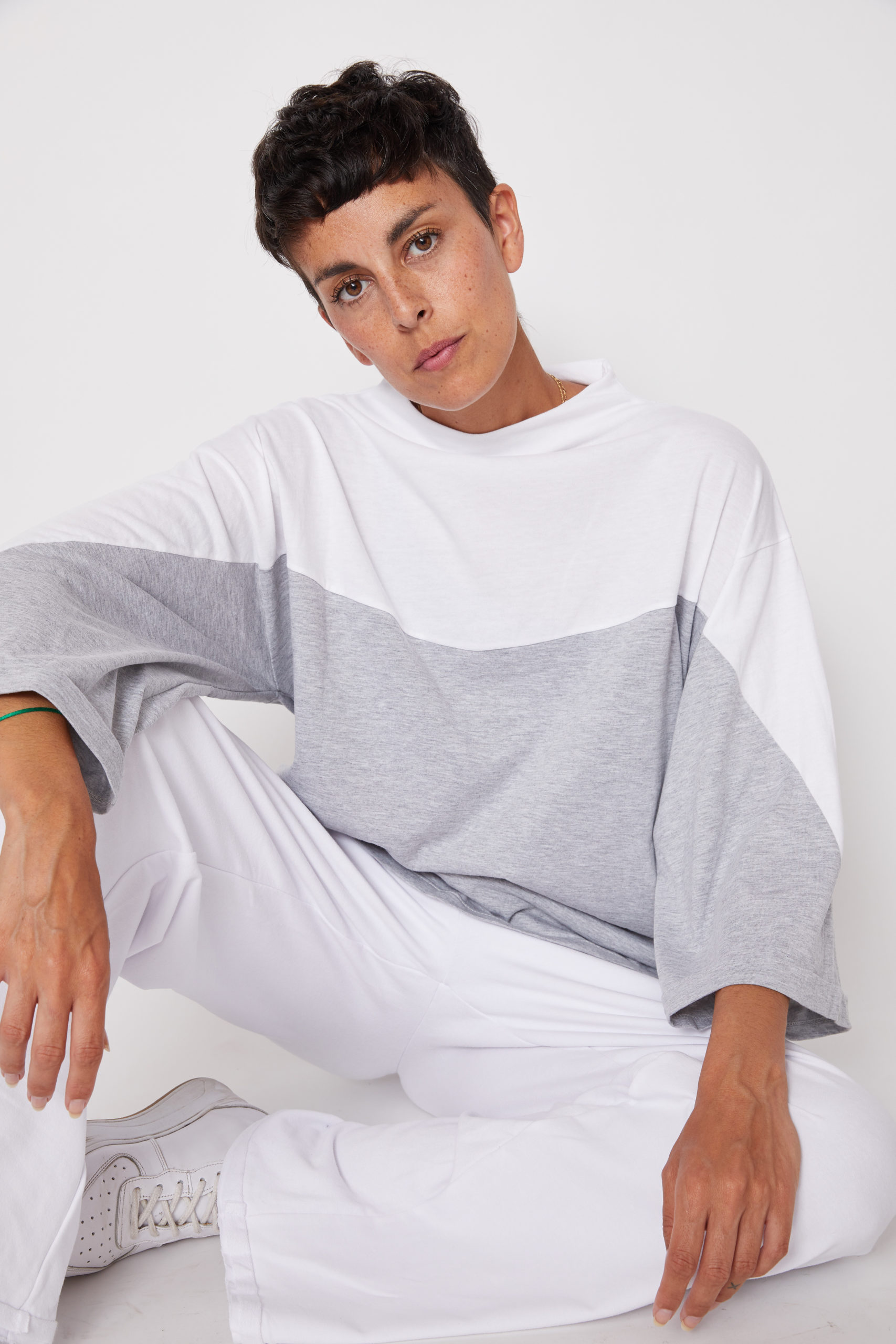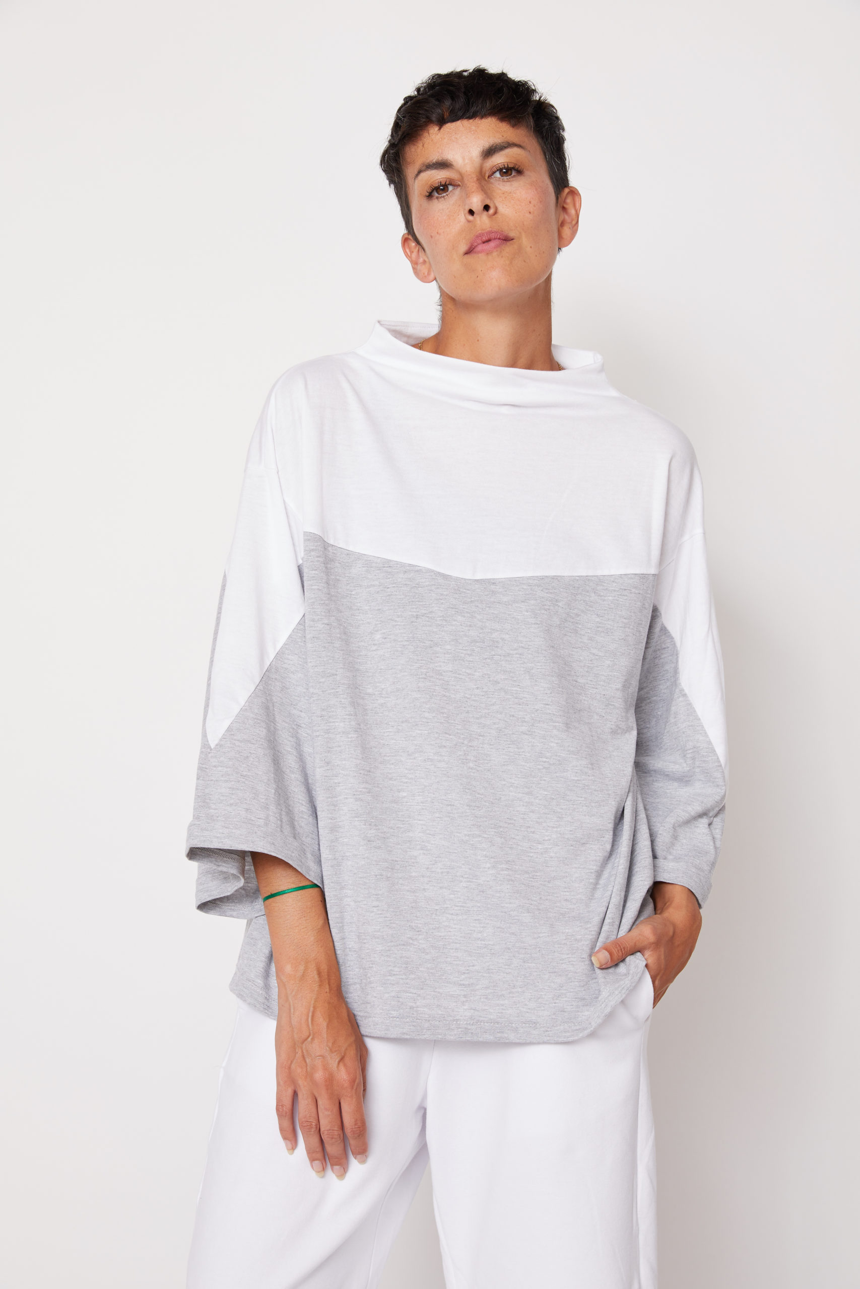 En jersey peinado 30/1, liviano y con cuerpo. Combinada en dos colores para que la tengas en todas sus variantes. Escote abierto midi, no tiene cuello polera pero tampoco cuello remera, ¡y lo linda que queda puesta! Mangas amplias tres cuartos, con ruedo invisible. Única en su especie. Composición: 100% algodón.