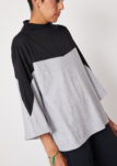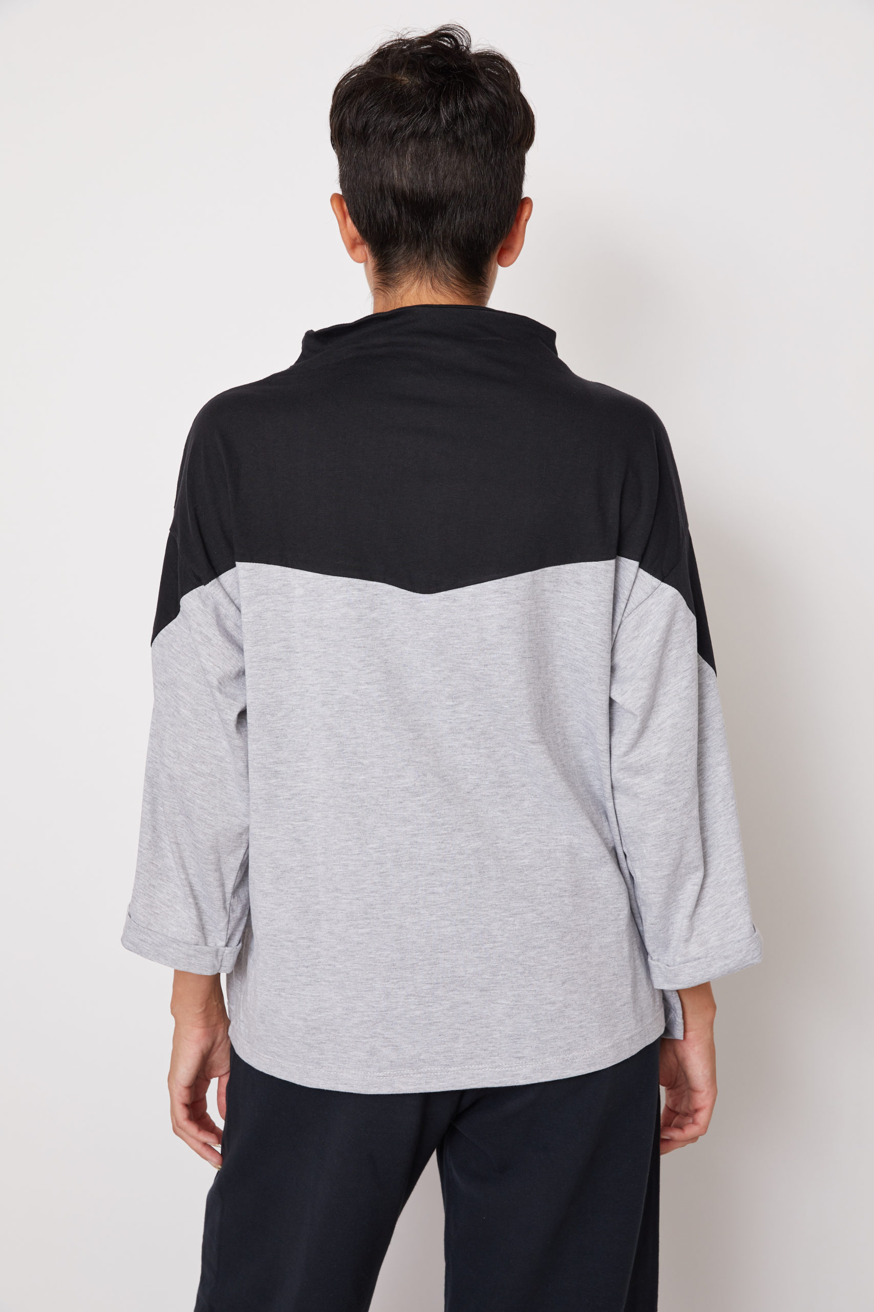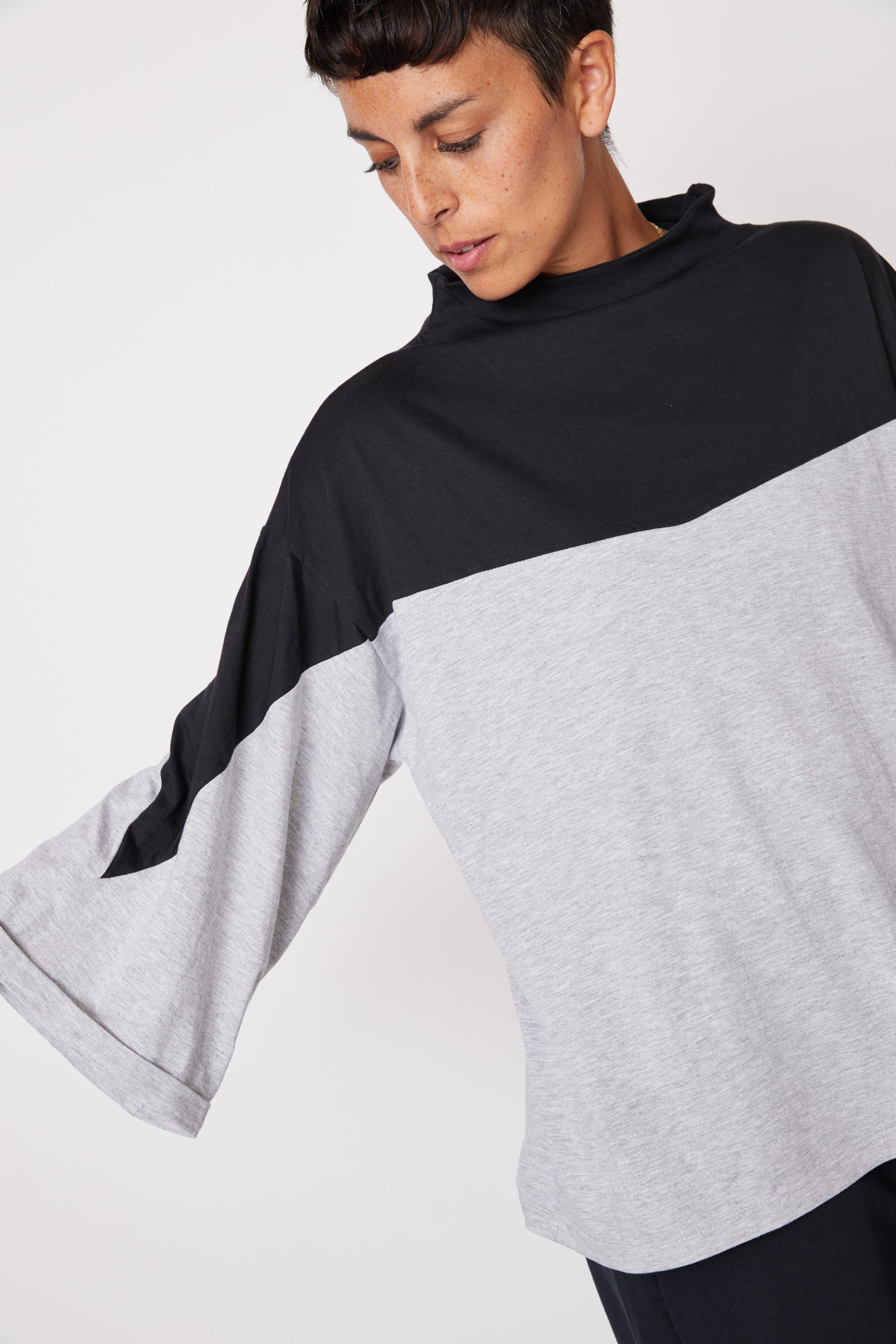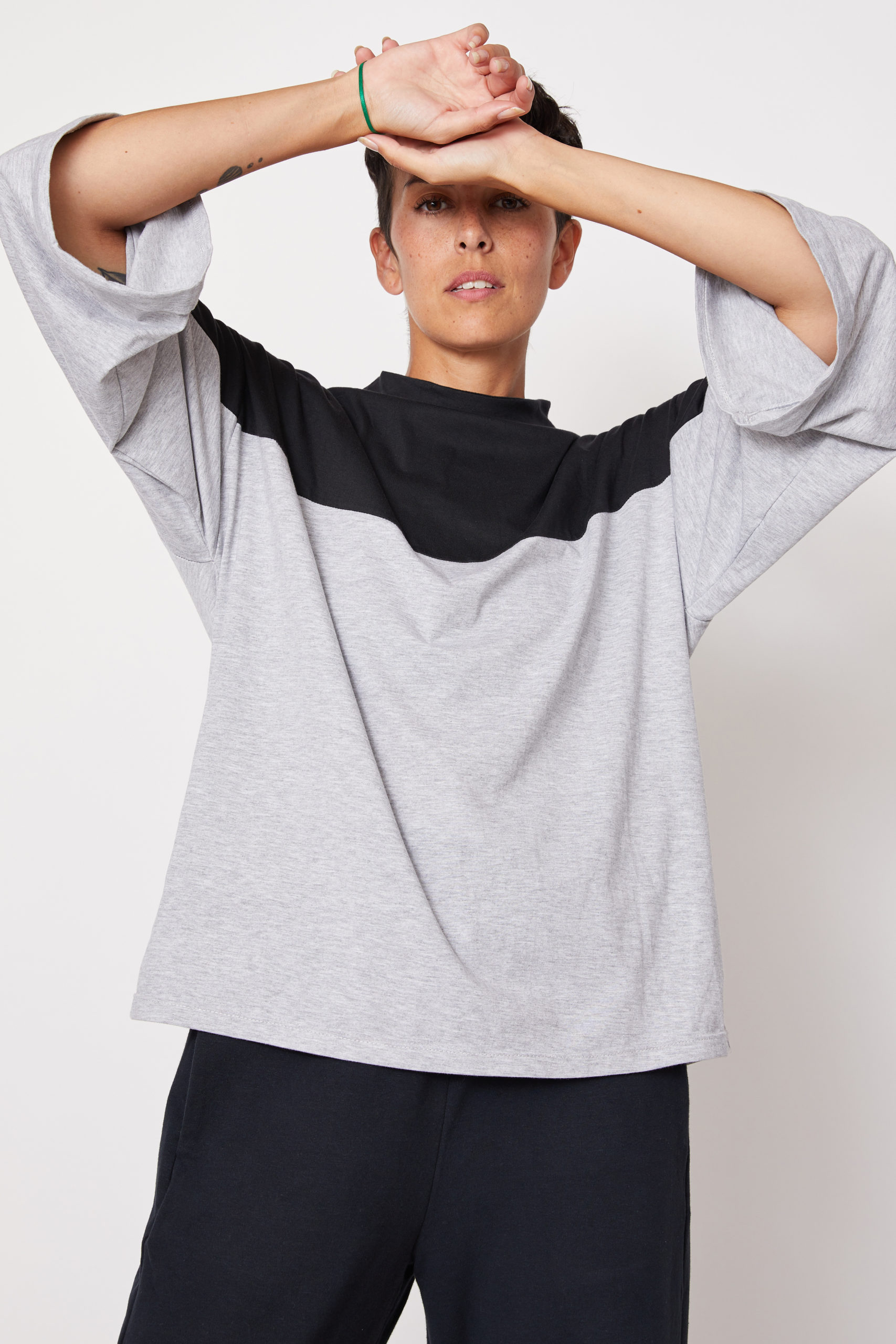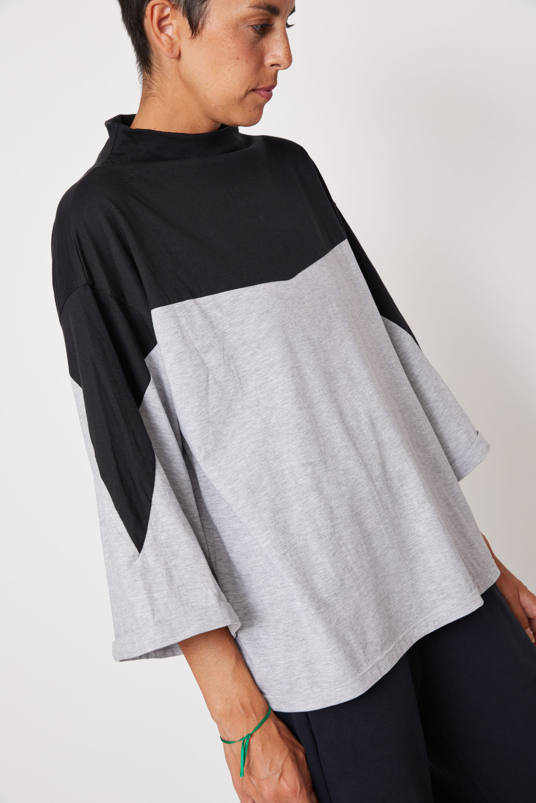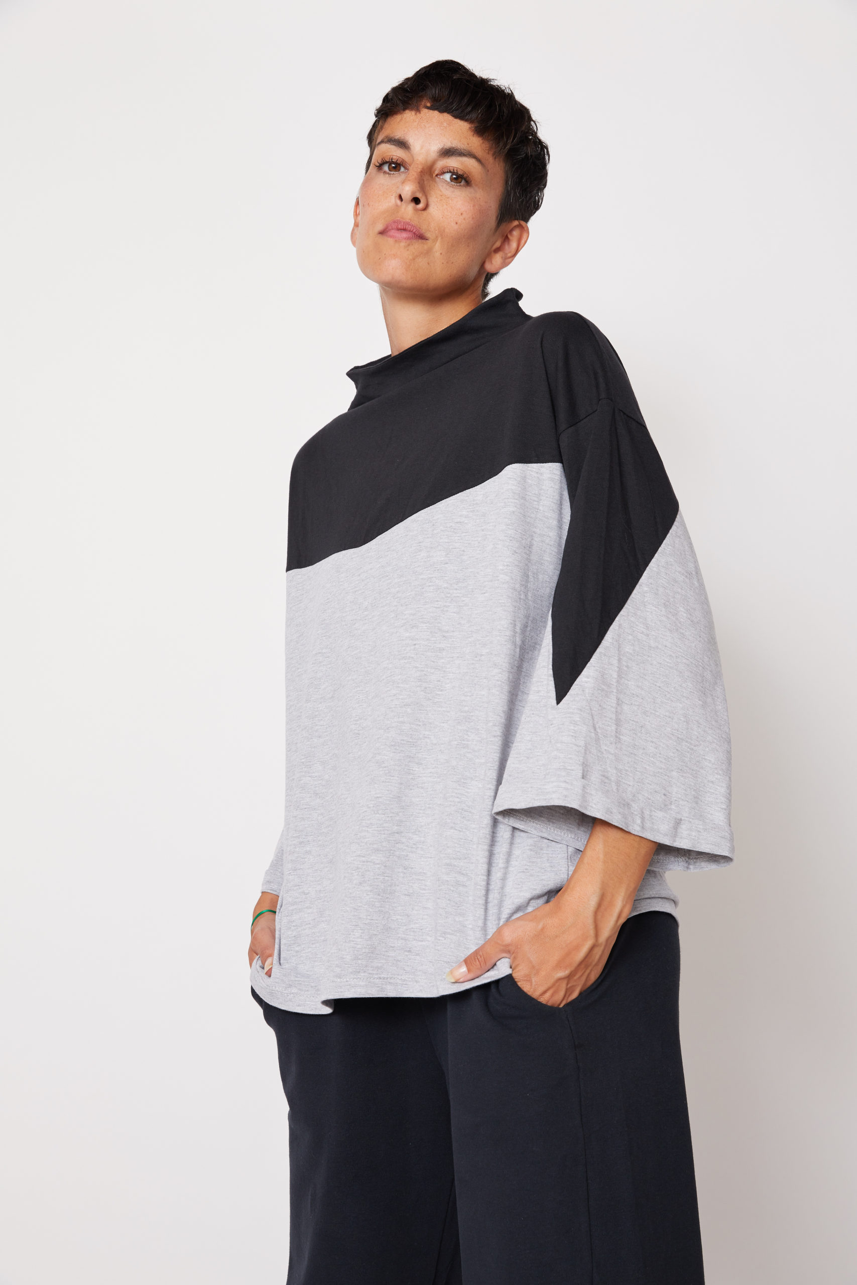 En jersey peinado 30/1, liviano y con cuerpo. Combinada en dos colores para que la tengas en todas sus variantes. Escote abierto midi, no tiene cuello polera pero tampoco cuello remera, ¡y lo linda que queda puesta! Mangas amplias tres cuartos, con ruedo invisible. Única en su especie. Composición: 100% algodón.
